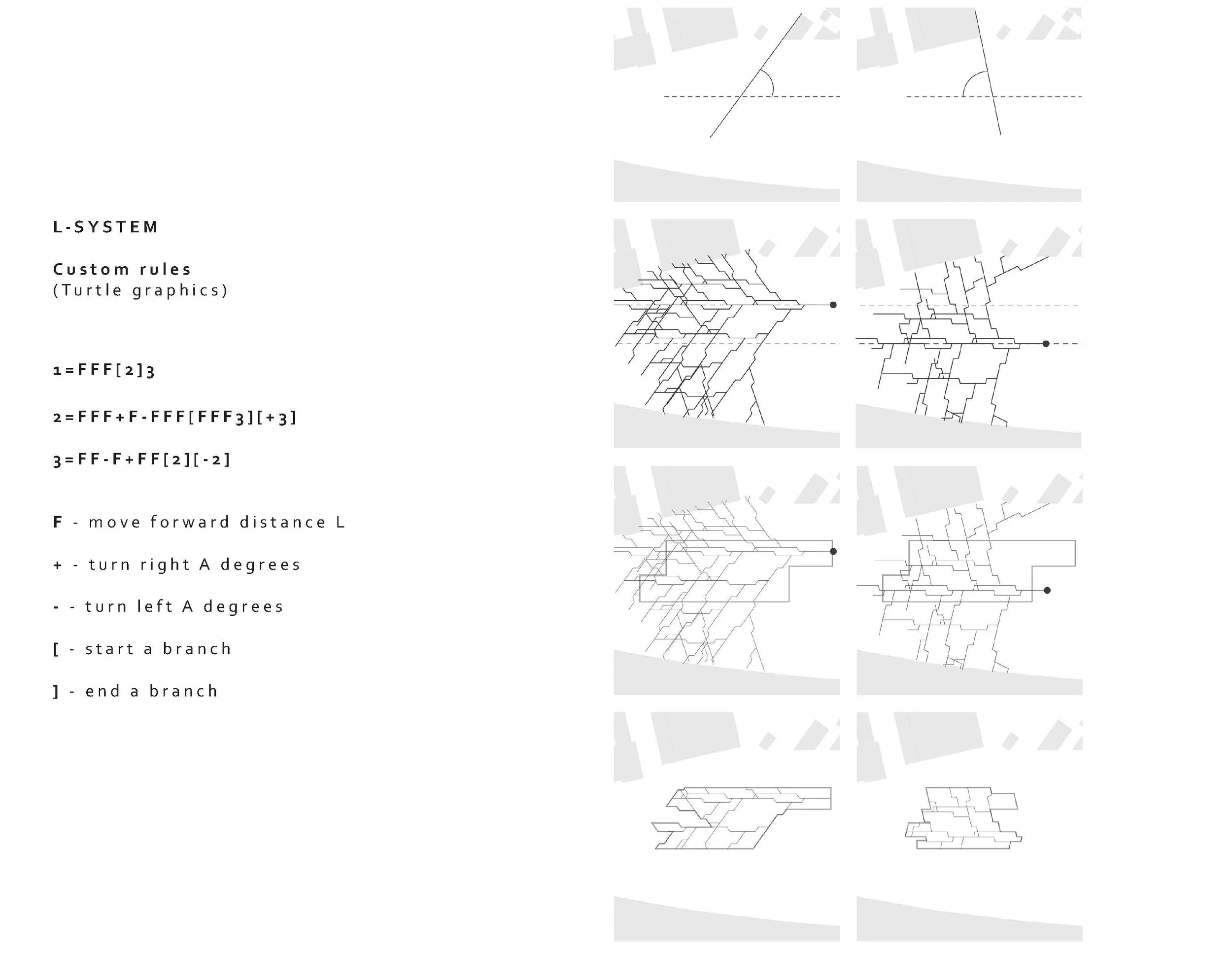 The Geometry of the building is generated through an L-system algorithm - a system by which most living things grow. The step-by-step logic is described below.