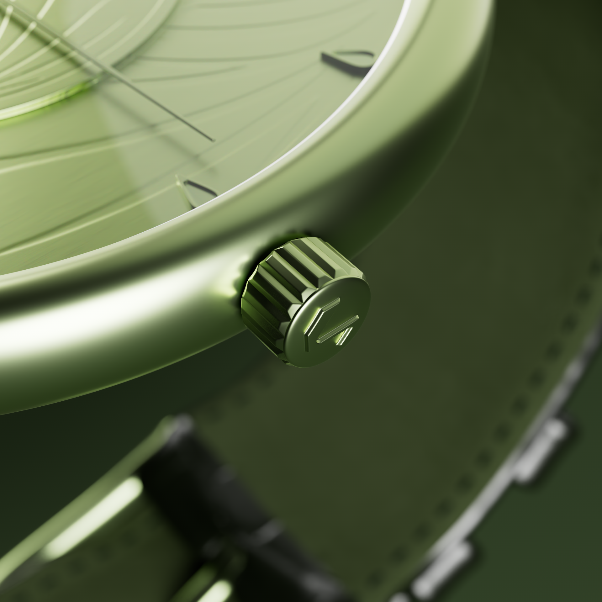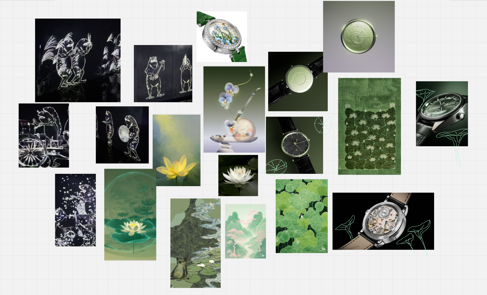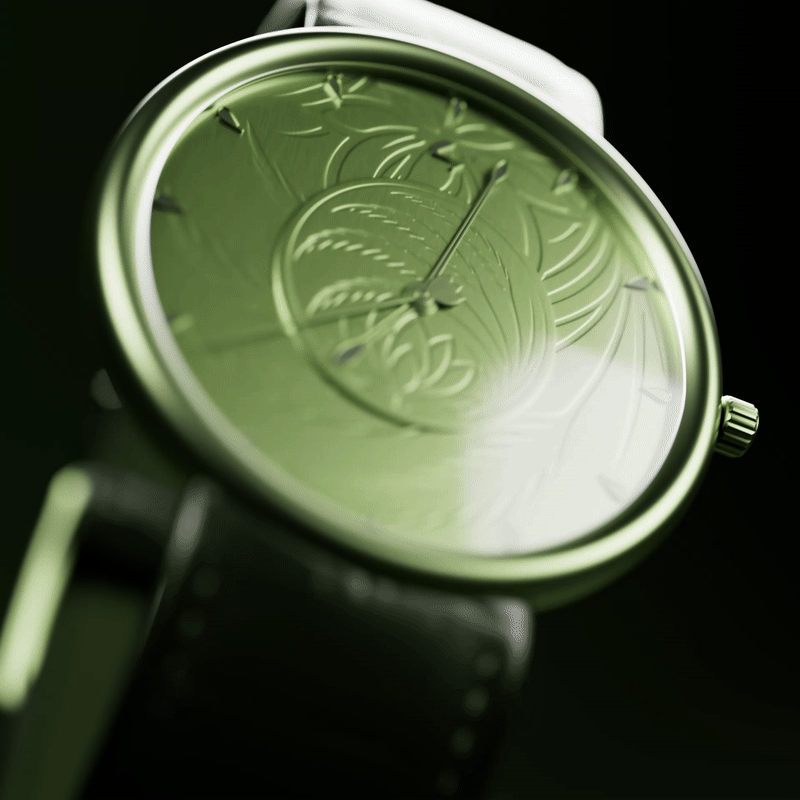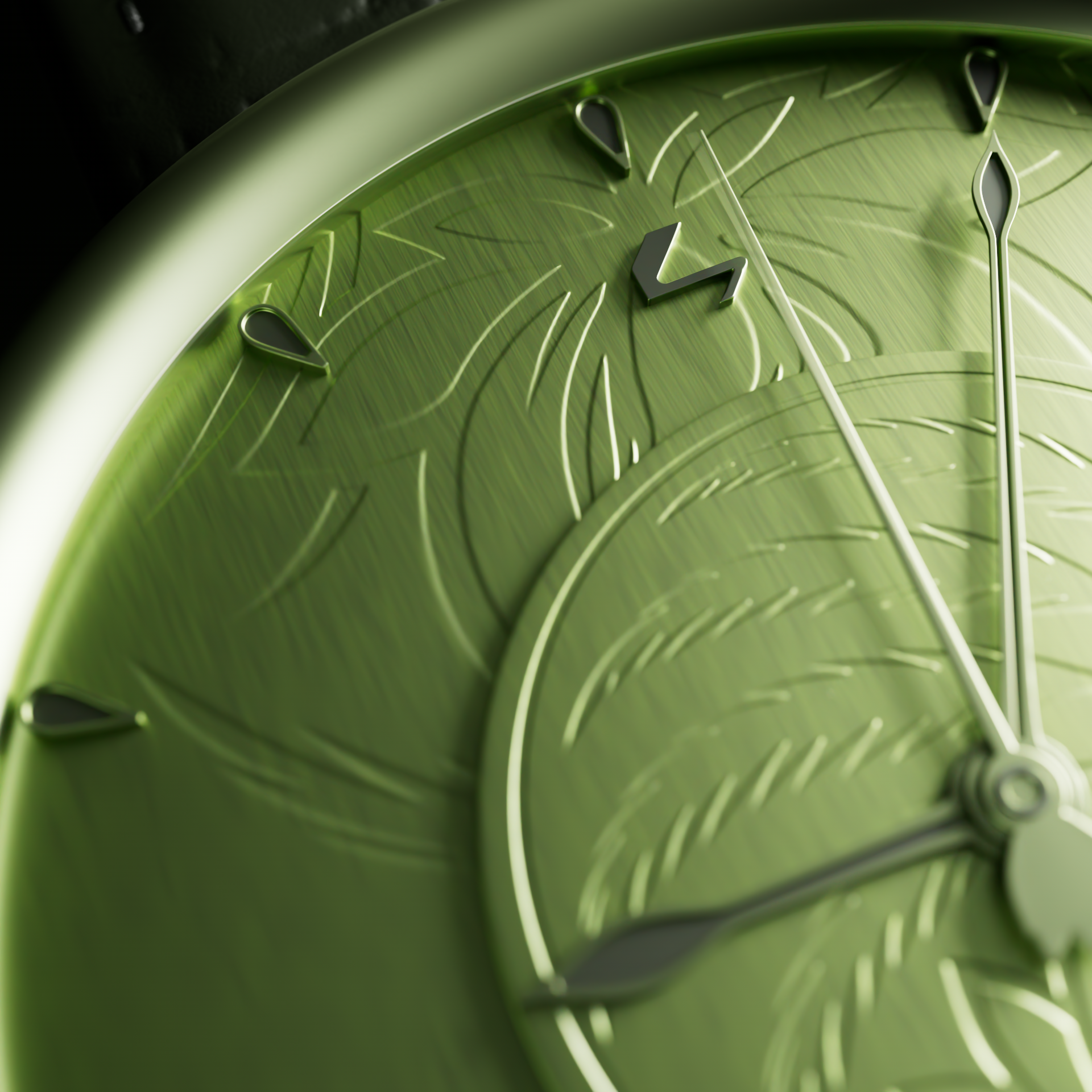 Dark, slightly faded green was the choice for the overall palette, connecting to the frogs and the lotus plant, while keeping sufficiently subdued to be worn as a dress watch.